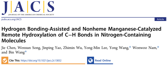 近日,milan米兰官网王斌教授课题组与宁波大学王永教授、韩国梨花女子大学Wonwoo Nam教授合作在国际化学领域权威期刊《美国化学会志》(J. Am. Chem. Soc. 2023, DOI: 10.1021/jacs.2c13832.)发表了题为“Hydrogen Bonding-Assisted and Nonheme Manganese-Catalyzed Remote Hydroxylation of C‒H Bonds in Nitrogen-Containing Molecules”的研究论文。