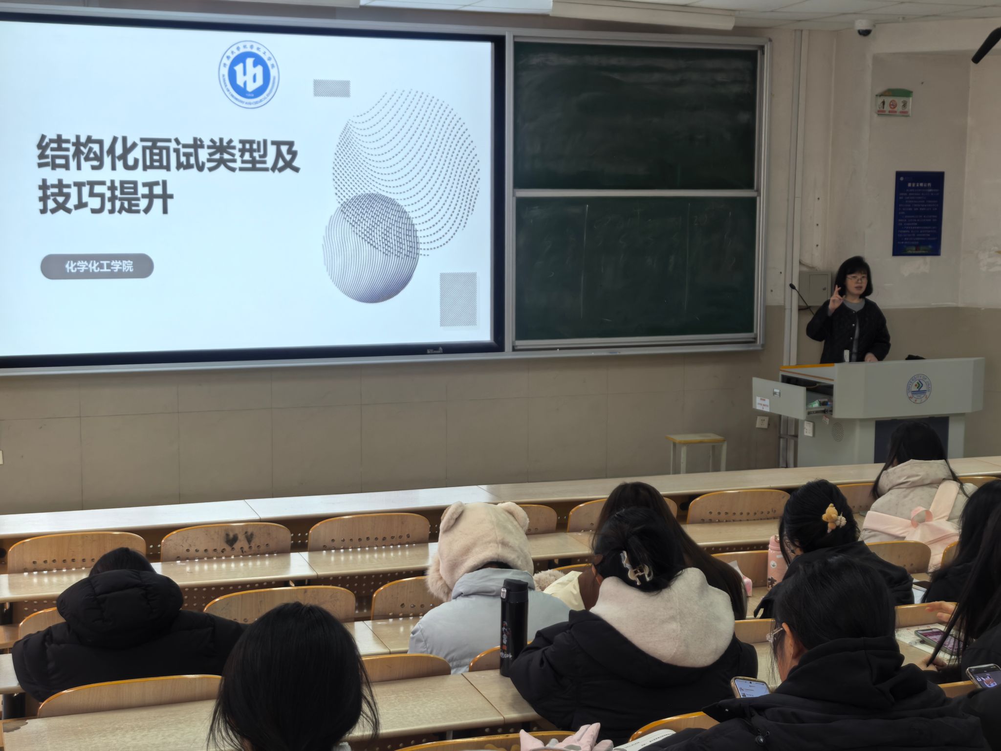 宣讲会上,李娟老师点明了结构化面试在企业招聘、公职类考试中的核心地位,强调其“标准化、规范化”的特点对求职者的重要性。随后,她系统解析了结构化面试的常见类型,重点围绕自我认知与岗位匹配类、人际沟通类、应急应变类、计划组织协调类、综合分析类五大核心题型展开讲解。针对每类题型,她不仅剖析了命题逻辑与考察重点,还结合化学、化工等专业的求职场景举例说明,如在“岗位匹配类”题目中,引导学生结合专业实验经历和科研项目经验等凸显与化工研发、生产管理等岗位的适配性。