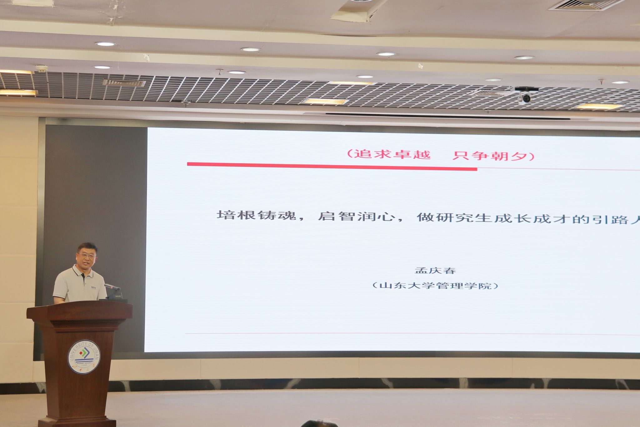 孟庆春以《培根铸魂,启智润心,做研究生成长成才的引路人》为题作专题讲座。围绕促进研究生教育高质量发展提出三方面建议:一是要强化思想引领,落实立德树人根本任务。了解掌握研究生思想状况,严格遵守科学道德和学术规范,把正确政治方向和价值导向融入教育和管理工作全过程;二是要坚持问题导向,开展富有价值的科学研究。紧跟时代,投身实践,聚焦学术,提升自我;三是要注重人文关怀,构建和谐共生的导学关系。在生活层面给予细致关心,在职业发展层面做好价值观引导。孟庆春结合典型案例,警醒研究生导师作为第一责任人必须明确岗位职责、立德修身、严谨治学、潜心育人,做学生的信仰之师、学问之师、品行之师。