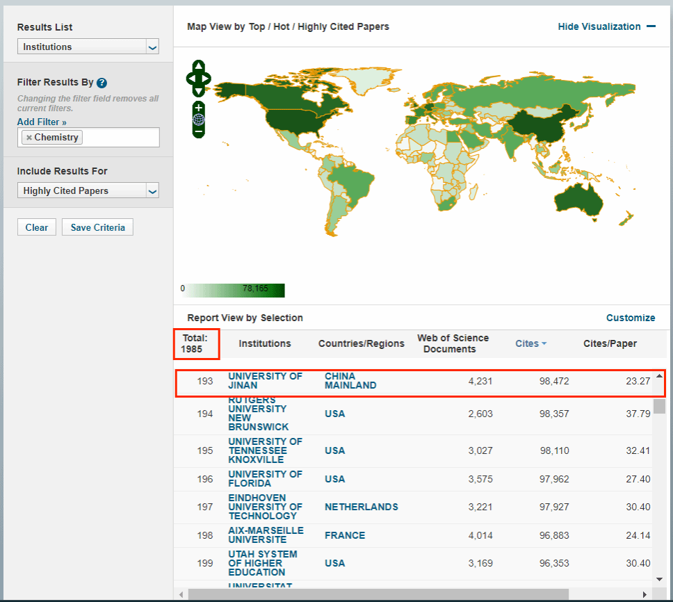 本期数据覆盖的时间段为2014年1月1日-2024年6月30日,化学学科全球共计1985所机构入围ESI全球前1%,门槛值为7910,我校化学学科全球被引排名第193位,共发表高水平论文4231篇,总被引频次98472次,篇均被引频次达23.27。