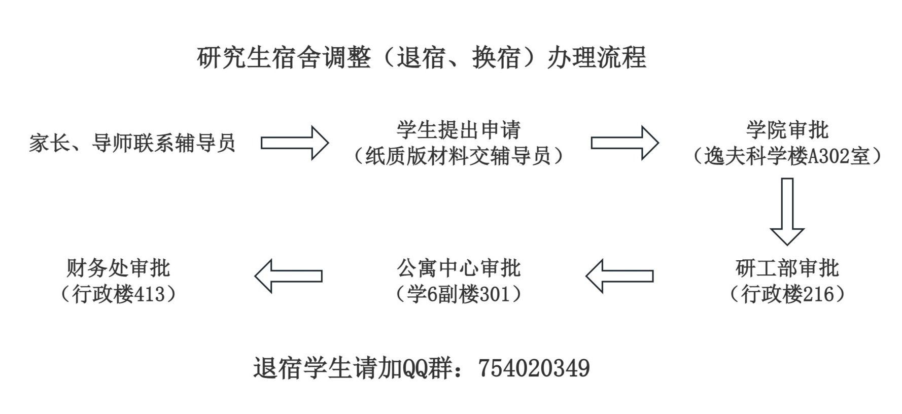 研究生宿舍调整(换宿、退宿)办理流程: