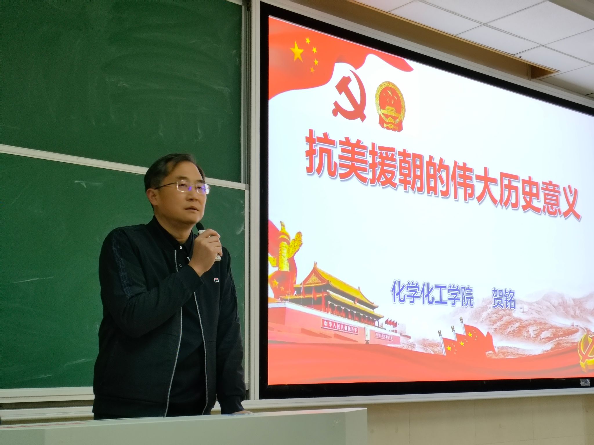 党课上,贺铭书记强调了党的历史知识学习的重要性。他通过丰富的图片等历史资料,详细为同学们讲解了“朝鲜战争发生的根本原因”、“为什么中国出兵朝鲜”、“战前中美力量对比及战况”以及“对新中国的发展产生的影响”等几方面内容,讲解了抗美援朝的历史背景、精神以及胜利的意义等,让同学们深刻感悟到弘扬伟大的抗美援朝精神,就是要传承红色血脉,用革命历史照应现实,用革命精神启迪未来。贺铭书记结合时代背景,详细介绍了在兵力、国力悬殊的情况下,中国人民志愿军赢得抗美援朝胜利这一伟大成就,通过对特级英雄杨根思、黄继光,一级战斗英雄胡修道、二级狙击英雄张桃芳等英雄事迹的生动描述,同学们深刻认识到抗美援朝战争伟大胜利背后的巨大牺牲,认识到志愿军战士艰苦卓绝的战役过程和不怕牺牲的顽强斗志,激励同学们在面对各种风险挑战、面对各种阻力压力时,要大智大勇、锐意进取,要逢山开路、遇水架桥、破浪前行。